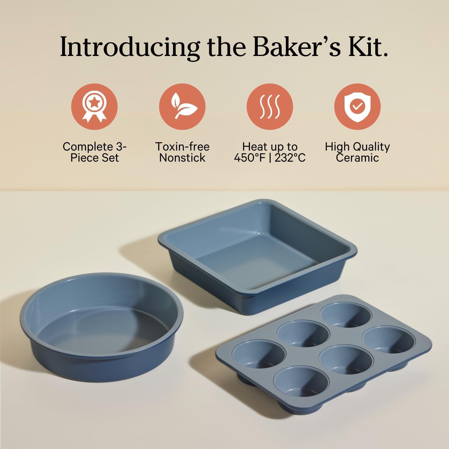 Our Place Wonder Oven Baker’s Kit – 3-Piece Toxin-Free Ceramic Nonstick Bakeware Set (8” Round, 8” Square, 6-Cup Muffin Pan) – Oven-Safe up to 450°F – Char(Blue Salt)