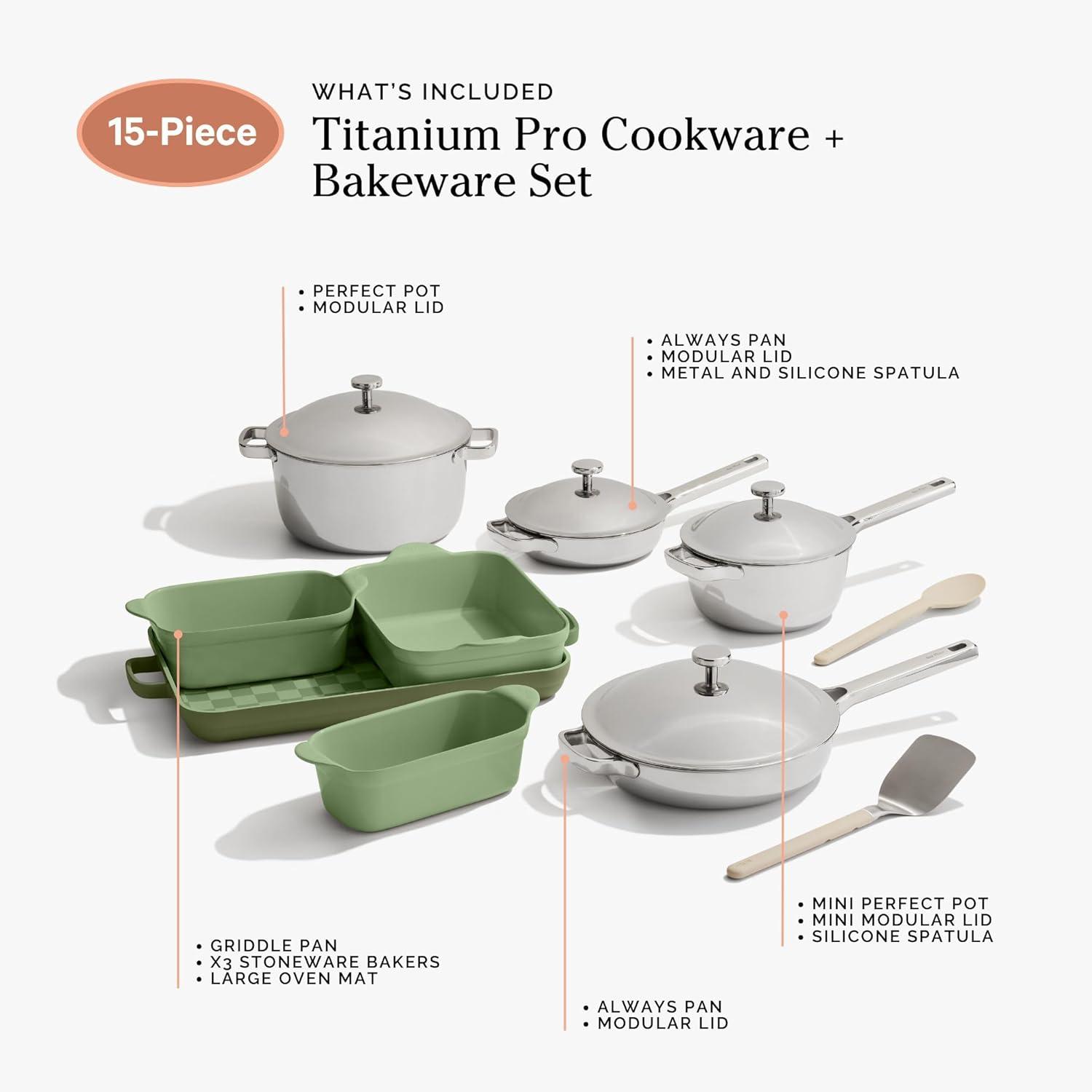 Our Place 15-Piece Titanium Pro Cookware & Bakeware Set | Tri-Ply Titanium & Stainless Steel Nonstick Fry Pans & Pots | Ceramic Nonstick Bakers & Griddle Pan | Non-toxic, PFAS-Free | Sage